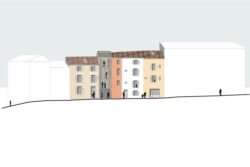 Ensuite, nous décidons de construire sur les traces des caves existantes et nous construisons peu., mais suffisamment pour offrir 9 à 10 logements et un commerce. Les espaces distributifs nouveaux seront extérieurs. En minimisant l’emprise bâtie et la surface de plancher créée, nous réduisons les coûts et préservons les espaces extérieurs.